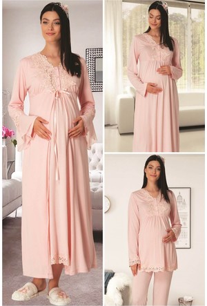 Lohusa Gecelik Tampap Dantelli Hamile 3 Parca Pijama Takimi