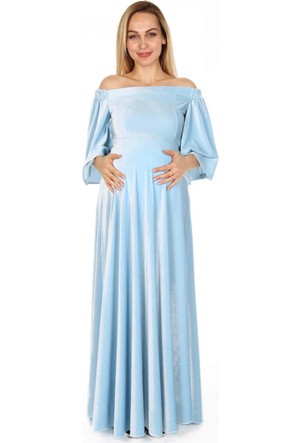 Moda Labio Babyshower Sifon Dusuk Omuz Hamile Elbisesi Bebe Mavi